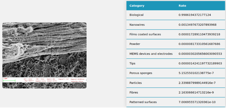 Input SEM image (left) and list of categories assigned by the SEM Classifier, sorted from the highest to the lowest rate (right)